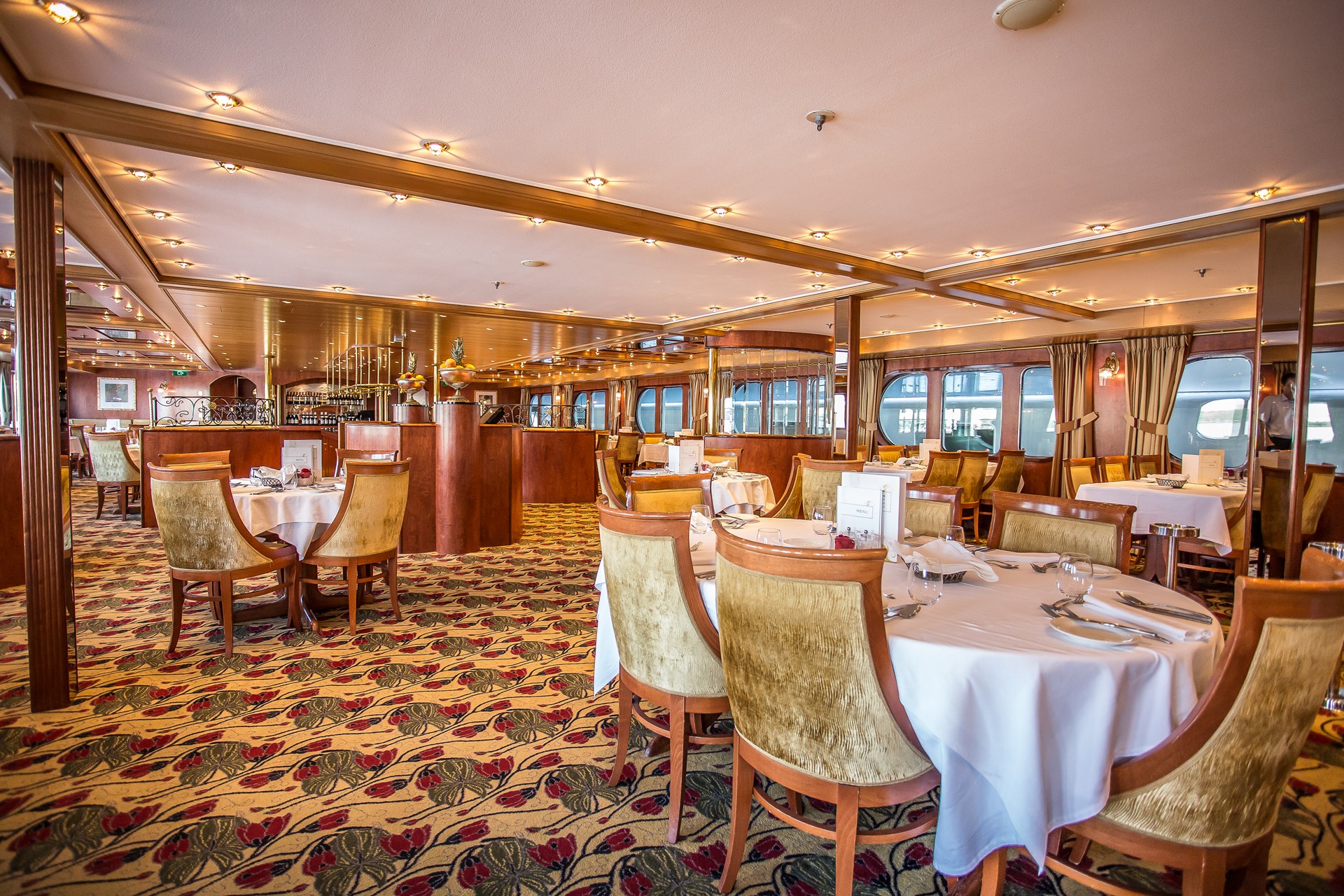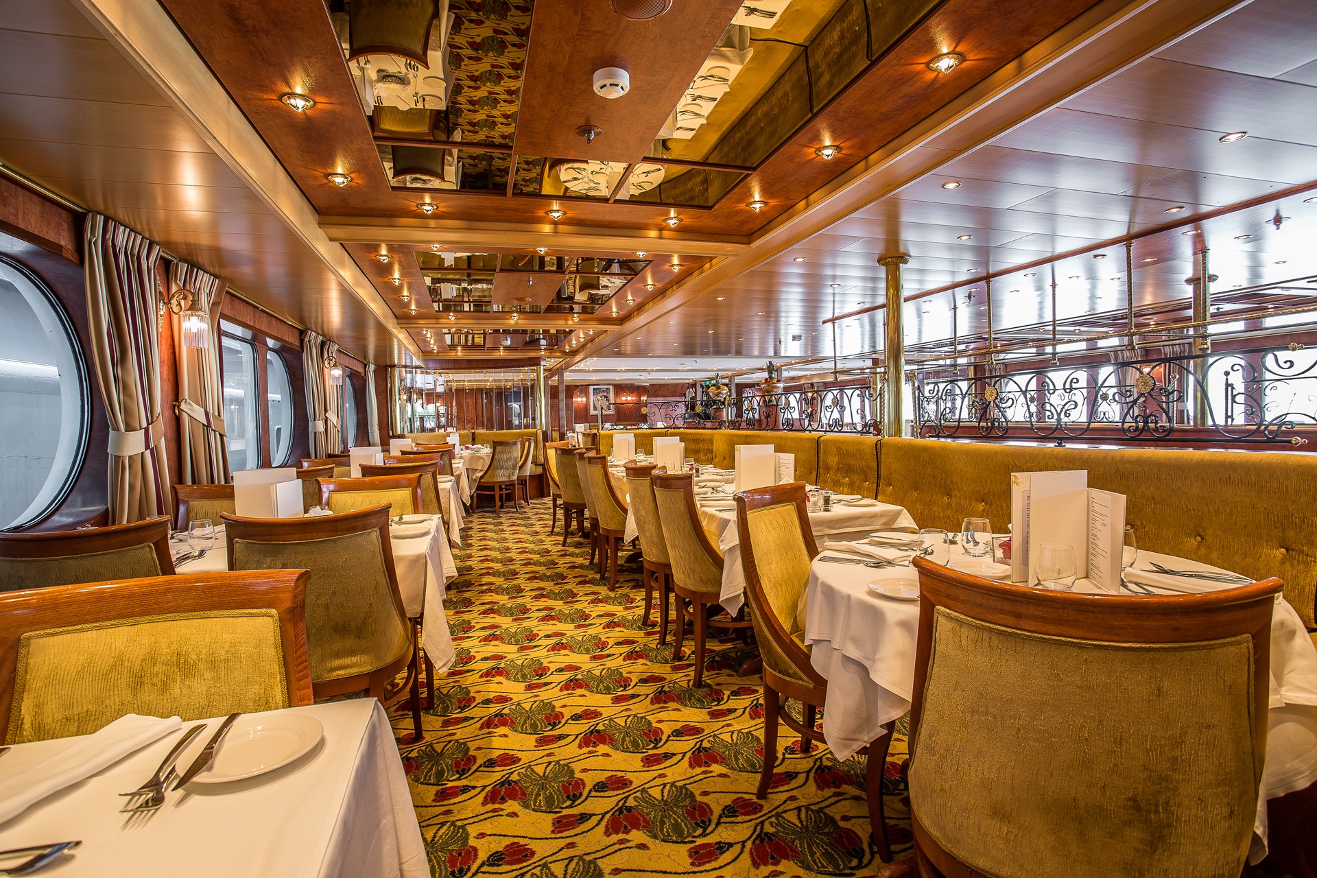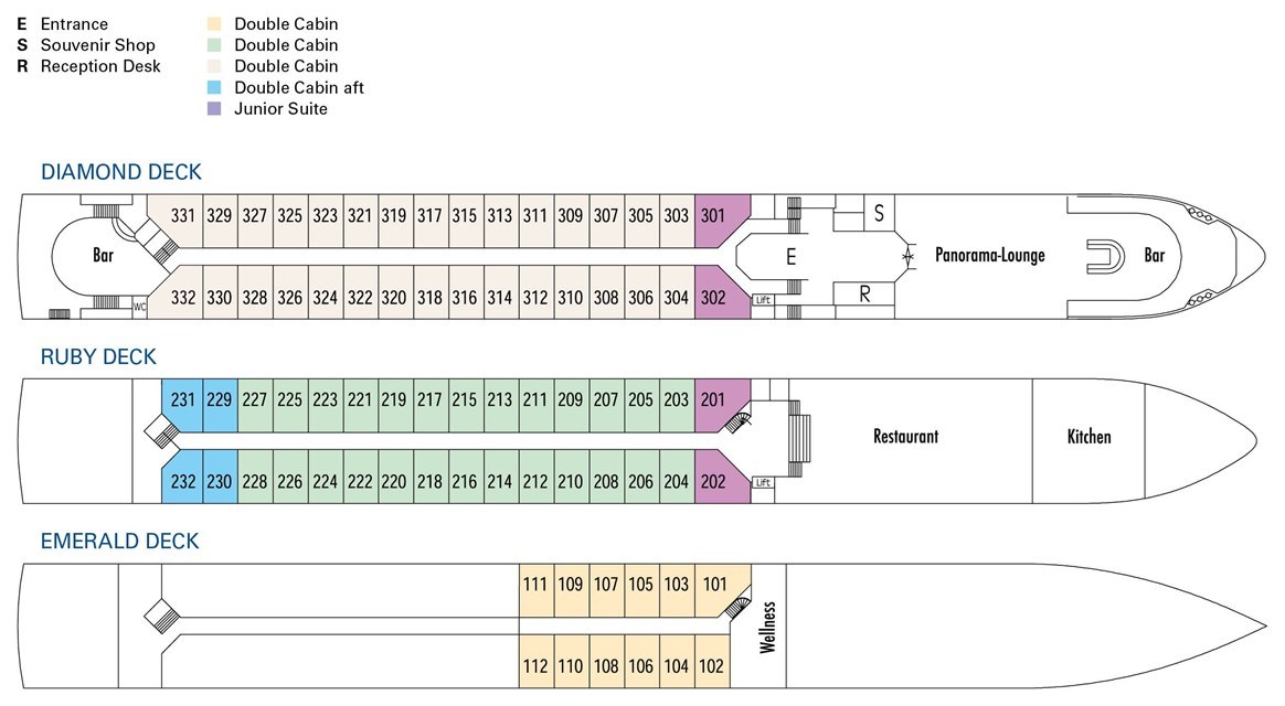 Op het Diamond dek (bovenste dek) kunt u heerlijk ontspannen in buitenkajuiten (14m2) en suites (16m2). De kajuiten op het Ruby dek en Diamond dek beschikken over openschuivende ramen welke van de vloer tot het plafond reiken (= Franse balkons). Hierdoor heeft u een onbeperkt zicht op de rivier, de mooie landschappen, en geniet u van 1.000 wisselende uitzichten. De kajuiten op het Emerald dek hebben kleinere ramen welke om veiligheidsreden niet te openen zijn.