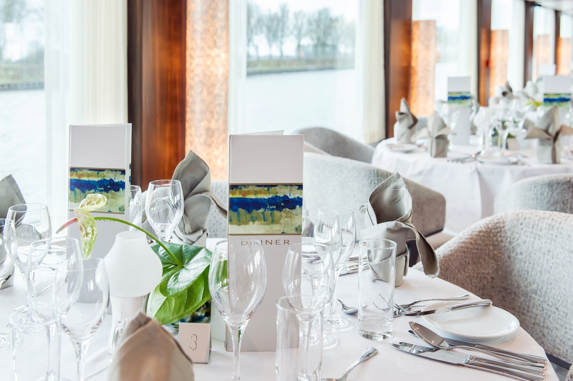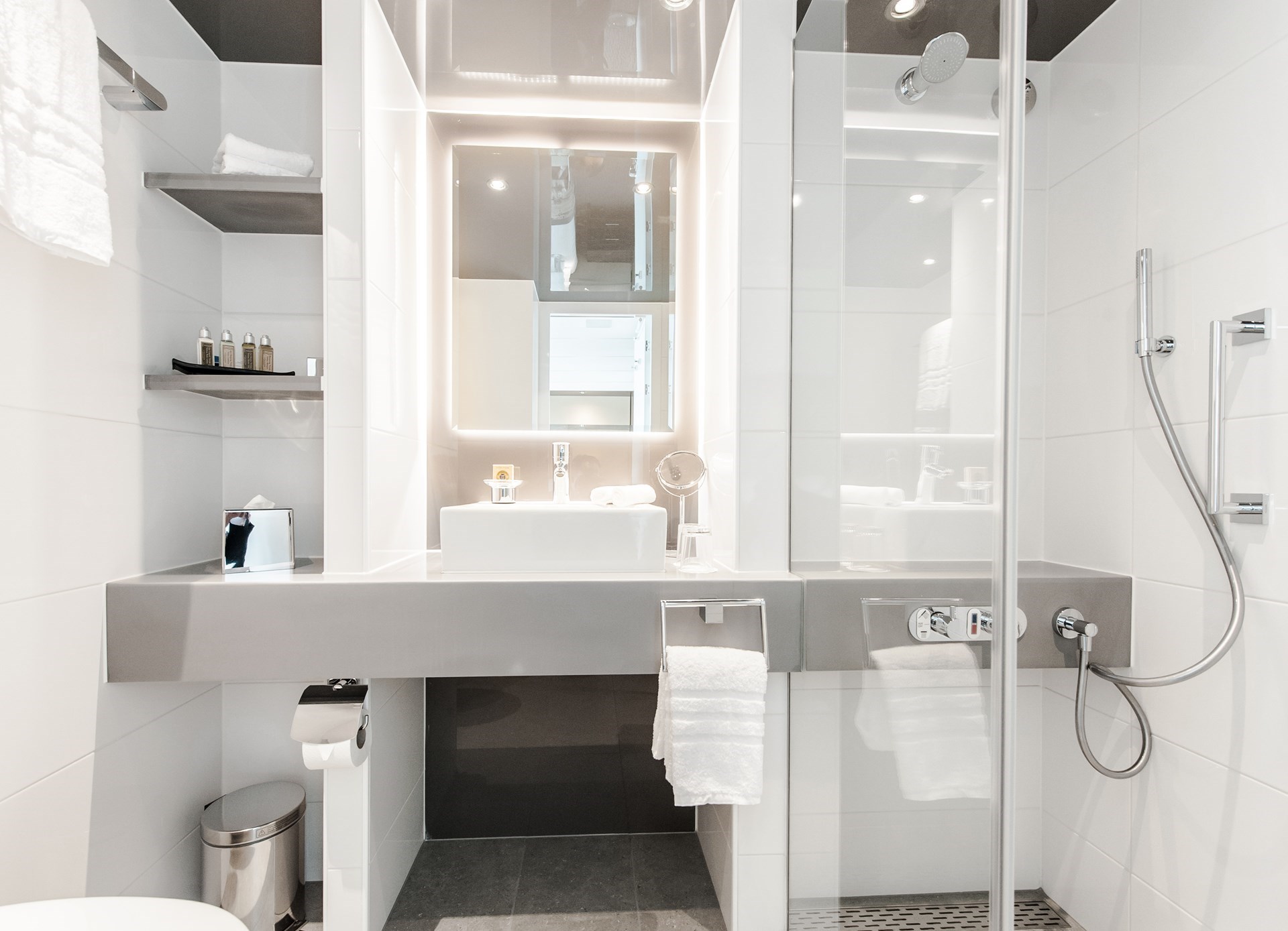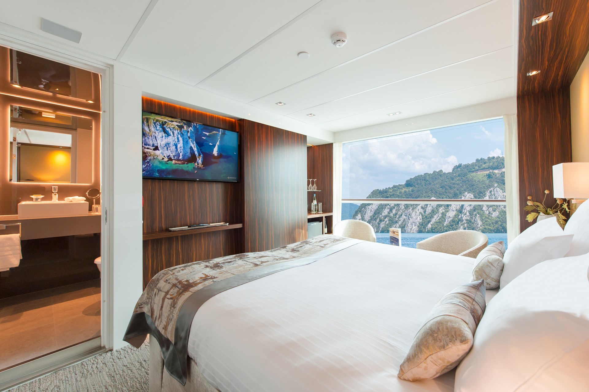 De kajuiten bieden alles wat u maar kunt wensen in een drijvend 5*-hotel: flatscreen-tv, minibar (Bovendek en Panoramadek) kluis, föhn, airconditioning, douche/toilet. Alle kajuiten zijn bijzonder ruim met veel lichtinval én een moderne, gezellige inrichting.