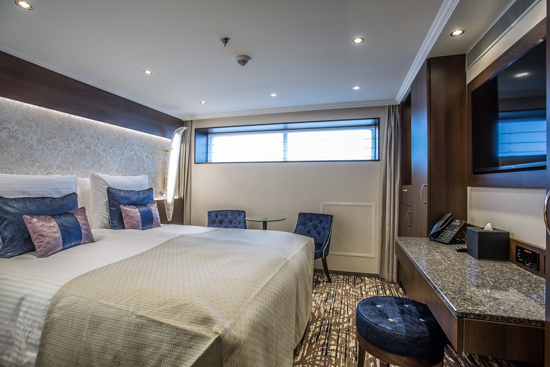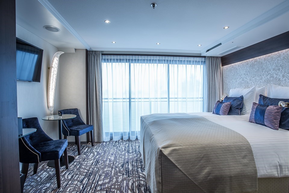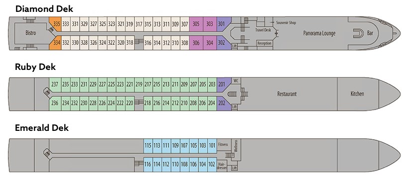 Stijlvolle en elegante buitenkajuiten, sfeervol en comfortabel ingericht, verspreid over 3 dekken. De kajuiten op het Ruby dek (middelste dek) en Diamond dek (bovenste dek) beschikken over openschuivende ramen welke van de vloer tot het plafond reiken en hebben Franse balkons. De kajuiten op het Emerald dek (= onderste dek) hebben kleinere ramen, welke om veiligheidsredenen niet te openen zijn. Alle kajuiten beschikken over douche, toilet, wastafel, haardroger, telefoon, radio, flatscreen-TV, minibar, safe, airconditioning, elektriciteit spanning 220 V wisselstroom. Tweepersoonskajuiten zijn 16 m2.